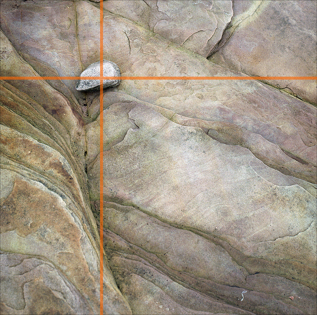 Not a perfect 1:2 & 1:2 arrangemetn, but the slanting lines in the sandstone and the crease running down from the pebble all combine to create a composition that works.