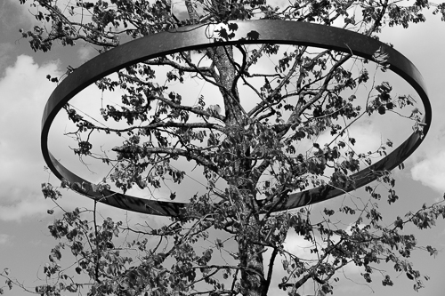 the iron hoop around the tree at the edge of the Olympic park concentrates your attention nicely on the trunk as it passes through it; a nice contrast of straight and curved.