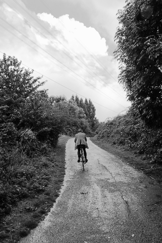 I had already started to frame up the way the twist in the path ahead of me combined with the greenery and sky to give a sense of a view that someone had reached out into, pinched between two fingers and twisted slightly in a clockwise direction when I heard the cyclist approaching behind me. I noted the diagonals of the power cables against the sky adding further to the sense that the view was directing itself towards the upper right third of the picture. Then the man on the bike zoomed past me and leaned out prior to following the loop of the road to the right. I released the shutter (or whatever it is you do with a digital camera). I like this picture very much, both in its black and white version, used here, and in colour.