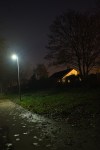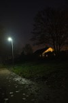 The final sequence was manufactured from one image by adjusting its exposure in Lightroom. The streetlamp always burns out, although the halo of light that surrounds it gets less intense as the pictures get darker. The “correctly” exposed picture is about right for how the scene felt at the time. In the lighter pictures, the glare of sodium lighting off to the rear of the house becomes increasingly lurid as the picture is moved towards overexposure and the way the path and leaves are lit becomes more and more as if it were day rather than night; similarly the surfaces – the tree in particular –  which are catching bits of orange sodium move towards an unpleasant lime/yellow. The two underexposed pictures work quite nicely, I feel with the streetlamp in particular and the leaves catching its light becoming more pleasing as the overall exposure moves further into darkness.