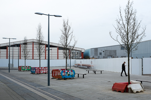 It was a bright day but with a typically flat, winter sky when I was leaving Reading Station, and an initial shot, taken at the setting indicated by the camera’s meter merely looked gloomy, whereas the scene was actually quite light with a lot of pale concrete and white hoarding; By overexposing by about 2/3 of a stop, the scene lightened to a point fairly close to what it looked like to my naked eye, without the coloured barriers and the red detailing on the building washing out.