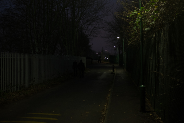 While this is much, much darker than average, giving I think a nice idea of the gathering night while walking home from the marshes. The only things brighter than average are the patches of light shed by the streetlights and the pleasantly windy line of the streetlights themselves leading the walking couple (and us) home. The colour is nicely concentrated without being simply black blackness as well.