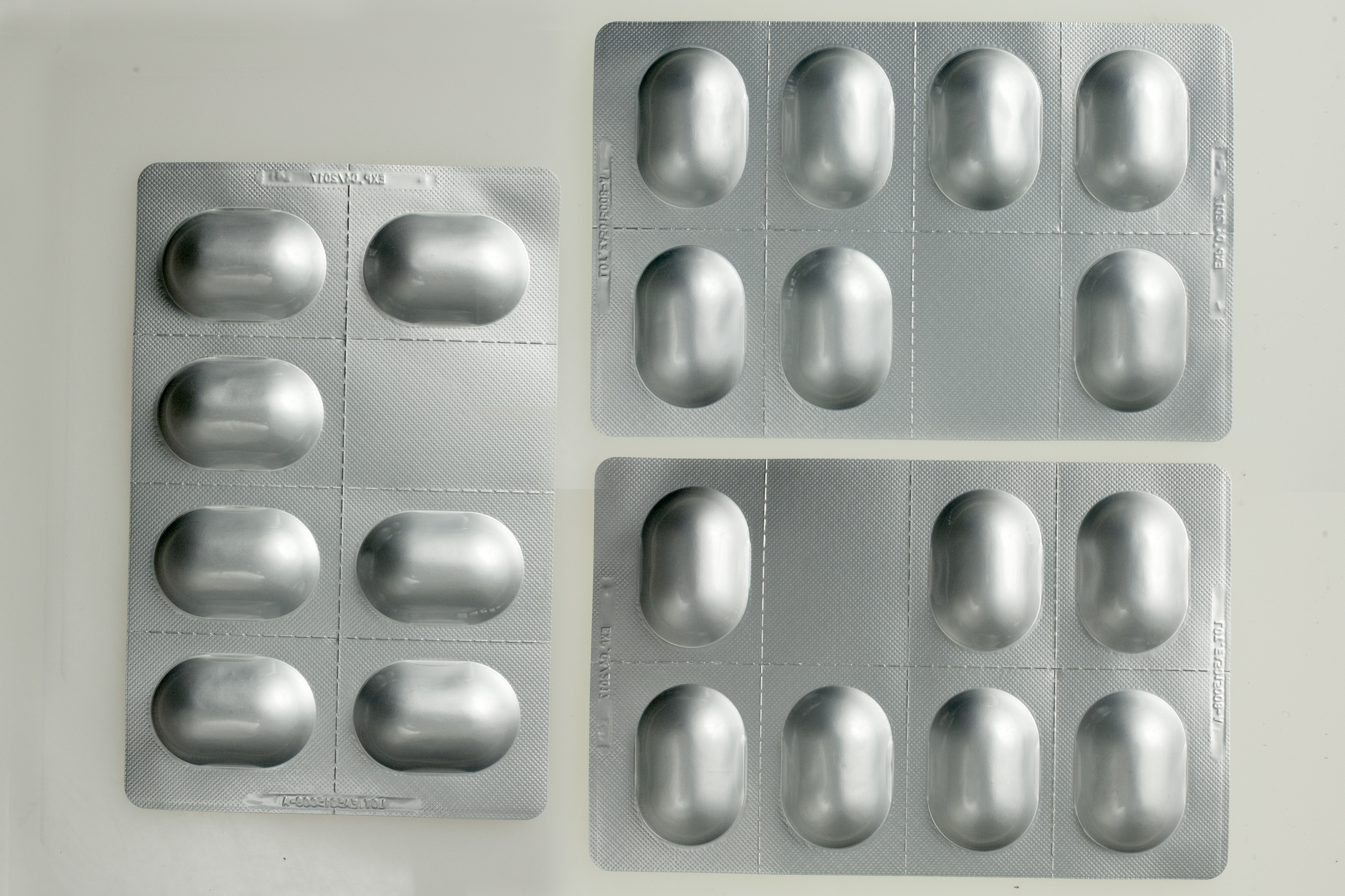 I made the image for this post the next morning after taking the first (post-breakfast) tablet. No longer having all three virgin strips, I photographed one strip rotating it so that the lighting (a diffused strobe over to the left of the strip of tablets which were sat on a light box to make a flat, white background and with a reflector to the right reducing the contrast) would be consistent for a collage of three of the pictures to make up the full week’s course. There is still a line to be smoothed out between the vertical strip of antibiotics and the bottom one on the right but the idea works well enough.