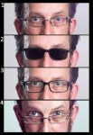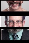 Having worked out where to split the strips – just above the eyebrows; above the curve of my nostrils and between my chin and my adam’s apple – I made a simple overlay that would allow me to get the eyes and mouth in the right place vertically and to use my nose as a centre point. I went through everything and manufactured a much more uniform series of pictures in PSE. I pored over the resuting set and worked out which eyes, which mouth, which beard and which moustache looked like it would work best and then – after making a four-strip overlay – started cutting some of the pictures up to quickly make a first dummy of the finished thing.
