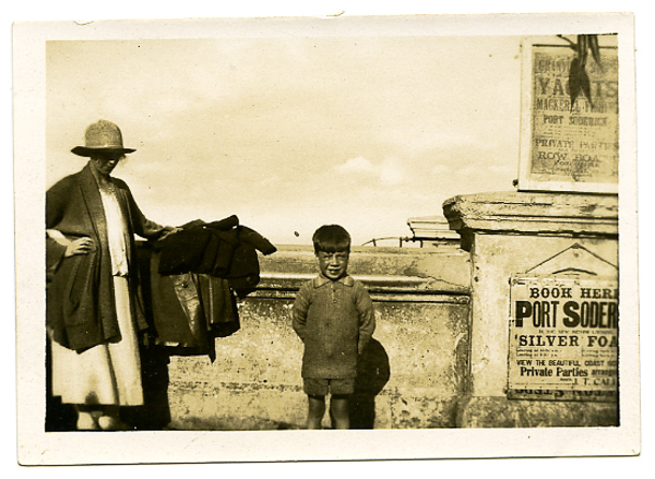 This is the first picture in Dad’s album. Eric Graham Chirgwin is about three years old and everything in it suggests he is  the focus of his devoted parents’ attention. His mother, Alice – Al – looks down from the corner, while he squints into the sun. A title “Gypsies…” is written in white paint on the grey card of the album’s first page.