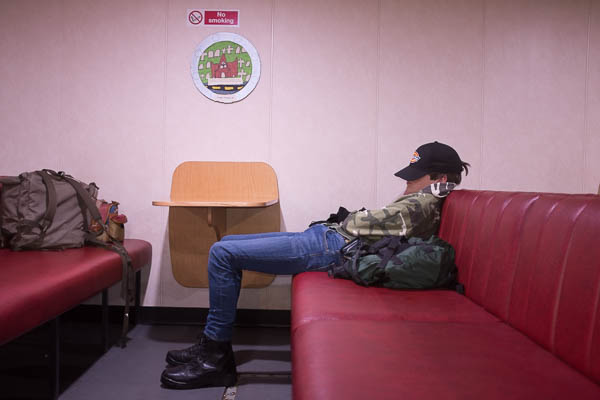 This is the most candid of the photographs. The rucksack and camera bag along with James’ hiking boots add minimal clues about what is going on here, but there isn’t much beyond that; it happens to be early in the morning, but with the absence of visual clues, could just as easily be on the way home again. The caption here is needed to add the correct context to what is actually quite a neutral setting.