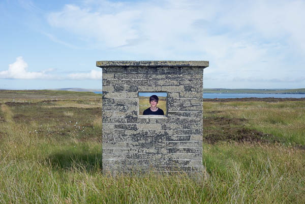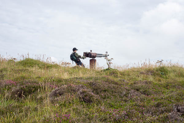 Around the coast of Flotta, there are a series of sculptures, made from scrap iron. Some, – three penguins, staring down at you  – are comic while others, like this one, refer back to the second world war when the island bristled with guns to protect the fleet in Scapa Flow. James scampered off and had a good play with this one.