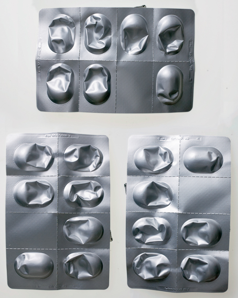 For one of the strips, each time I popped a pill from its bubble on the strip, I nipped up my attic workroom and shot 6 pictures of the packaging: one of the front with the writing, one of the back with the bubbles; then the same two pictures but with the strip rotated through 180 degrees; then the same two pictures rotated a further 90 degrees. The idea was to get the highlights and shadows right to allow a composite, matching the first “week” and giving a different take on the idea of time passing while I took the medicine.