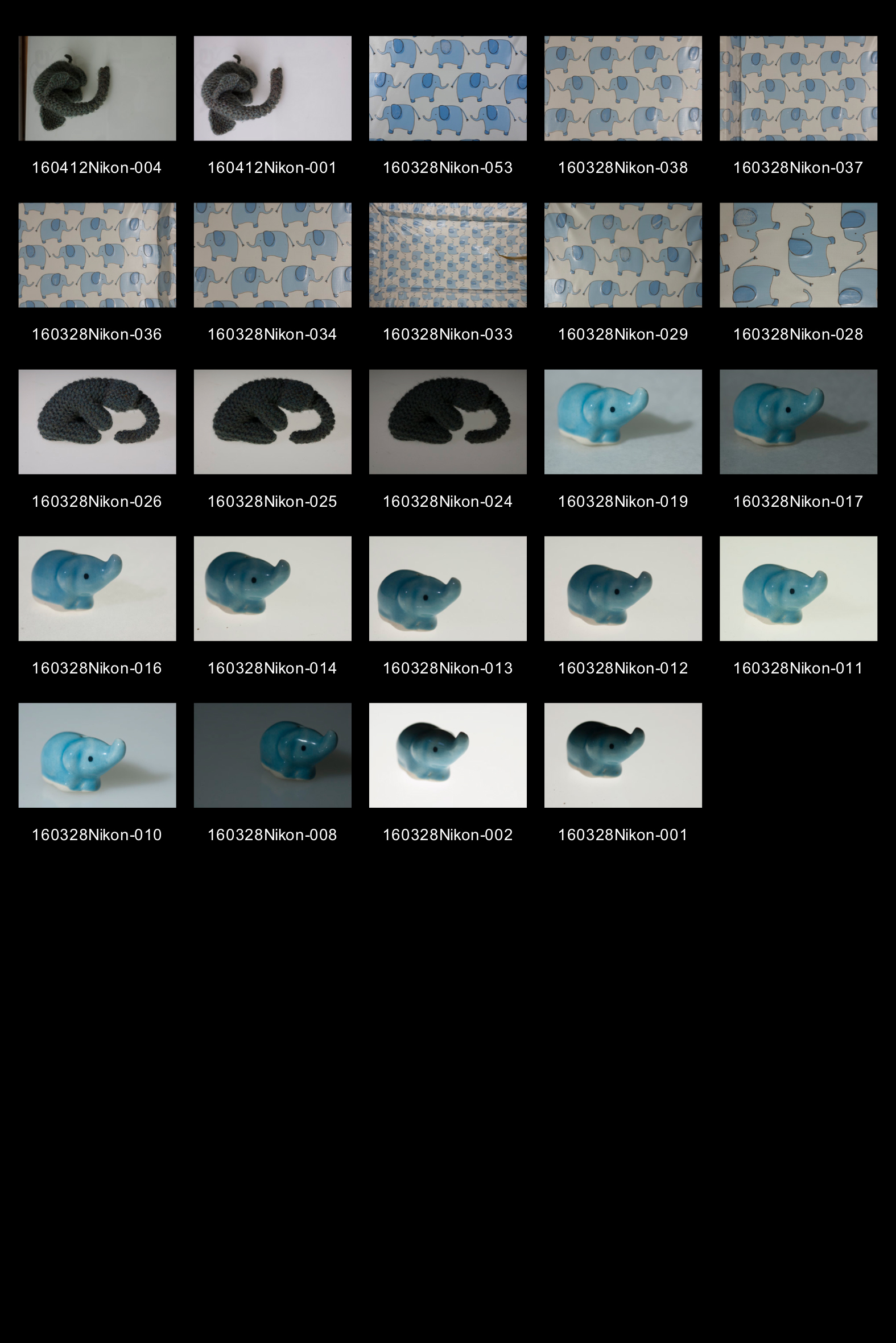 I now had a portrait ratio picture of 60 elephants (10 rows of 6) that would match the two pictures of the pills packaging once they had been cropped to a 5:4 ratio. I tried to crop a portrait ratio picture out of my single elephant pictures but couldn’t quite manage it. I quickly reshot a picture of the knitted elephant (again on the light box, with the 105mm lens stopped down as far as it would go. I tried a less flat composition this time, instead shooting the elephant in three quarter face  and it worked nicely (160412Nikon-001 & 004), I thought. Having 4 pictures (1 second, 60 seconds, a week and a week that was passed) I quickly went through my options for another four pictures in loose pairs.