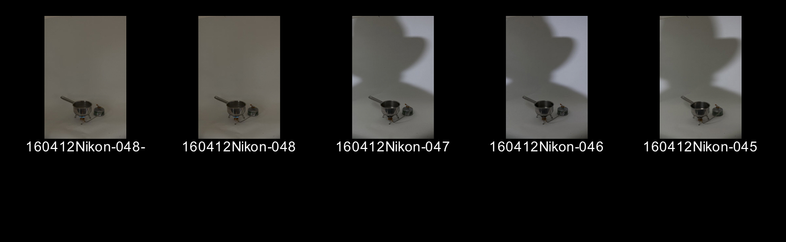 Then for my final picture, I rejected  the “week of Sundays” idea (at least in part because I’d have to wait another fortnight or so to build up my month’s worth of papers, but mainly because it would be too like “lifetime” to be a proper development of the idea) and instead tried to work out a way to picture a watched pot (which of course would never boil). There is not enough space in the kitchen of my house to do this on the hob, and anyway, doing a final set-up picture would complete the series nicely. I bought a gas stove from a camping shop (it would come in handy later to have in the car for tea-making on trips into the country, I rationalised) and set it up at the end of the long axis of the attic, in front of a white paper backdrop. I already knew that a small (ie undiffused), distant light source produced contrasty light, and so also led to well-defined shadows. I placed a bare strobe, flat on to the stove and pan at the far end of the attic. So it would not cast a shadow itself, I set up the camera on a sturdy tripod above the strobe, where it would be able to see the setup over the shadow casting  object. Again, I was using the 105mm lens.