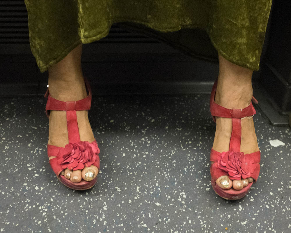 Early on, I gave up on trying to get a serendipitous spectrum (black/red to violet/white) as there were too many brown shoes while no one wearing yellow shoes sat down opposite me and in the end I had between around forty pairs of feet to choose from, with up to four ‘goes’ at getting the picture I wanted.