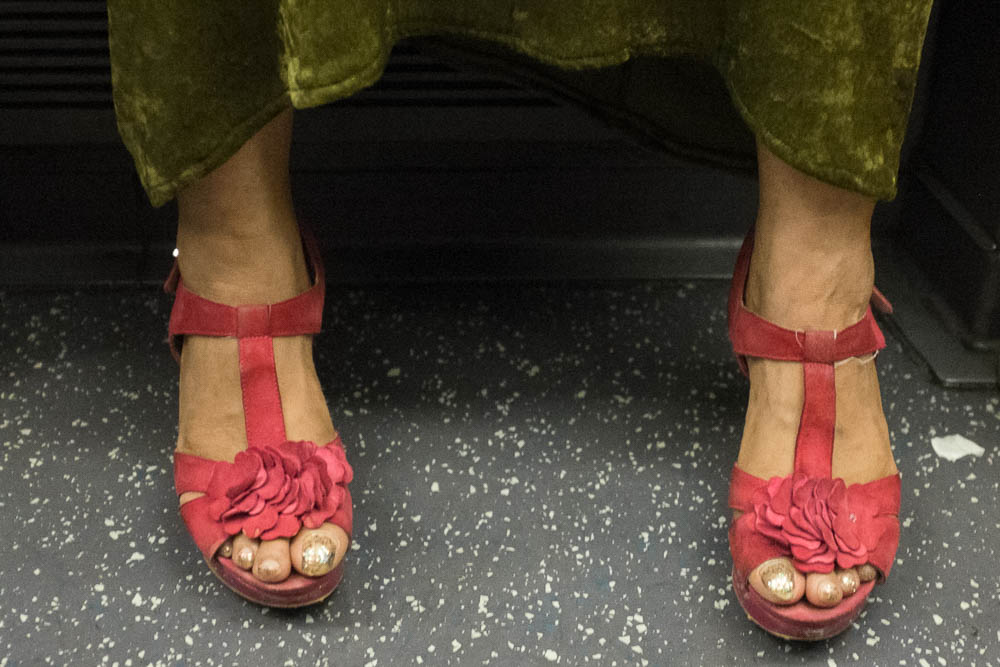 Then: how comfortable is someone with the limited space they have to occupy? Have they taken care of their feet? Adorned them even? Which normally-hidden tattoos will surface now that it is summer? Can you tell what is being piped into their ears by their phone by looking at their feet?