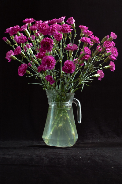 At this point however, the deadline for the assignment was looming and I just needed to knuckle down and shoot something; it was Valentine’s day and my partner gave me a bunch of carnations. As they fell into some sort of arrangement in a glass jug, I realised I had found my subject and also that the short lifespan of cut flowers would force me to work reasonably quickly. I cleared enought space in the living room to make a start and began making the pictures.