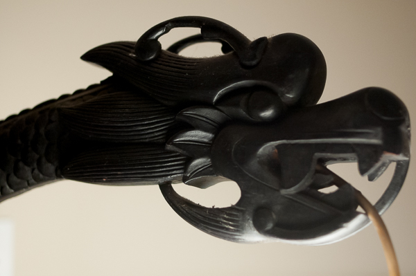 I started looking at lights that were already present in the house with the idea of the subject lighting itself in some of the pictures, settling on either an anglepoise-type lamp which offered a lot of nice, variable geometry or a 1920s wooden standard lamp in the form of an oriental dragon which would produce more diffused light through its paper lantern lightshade.