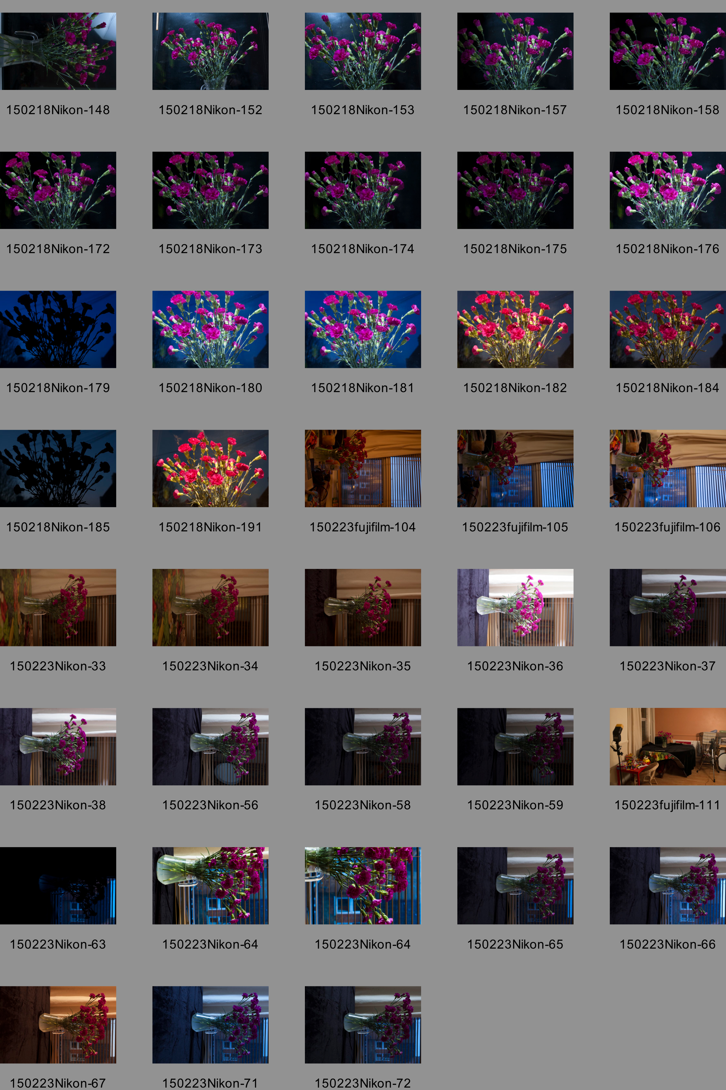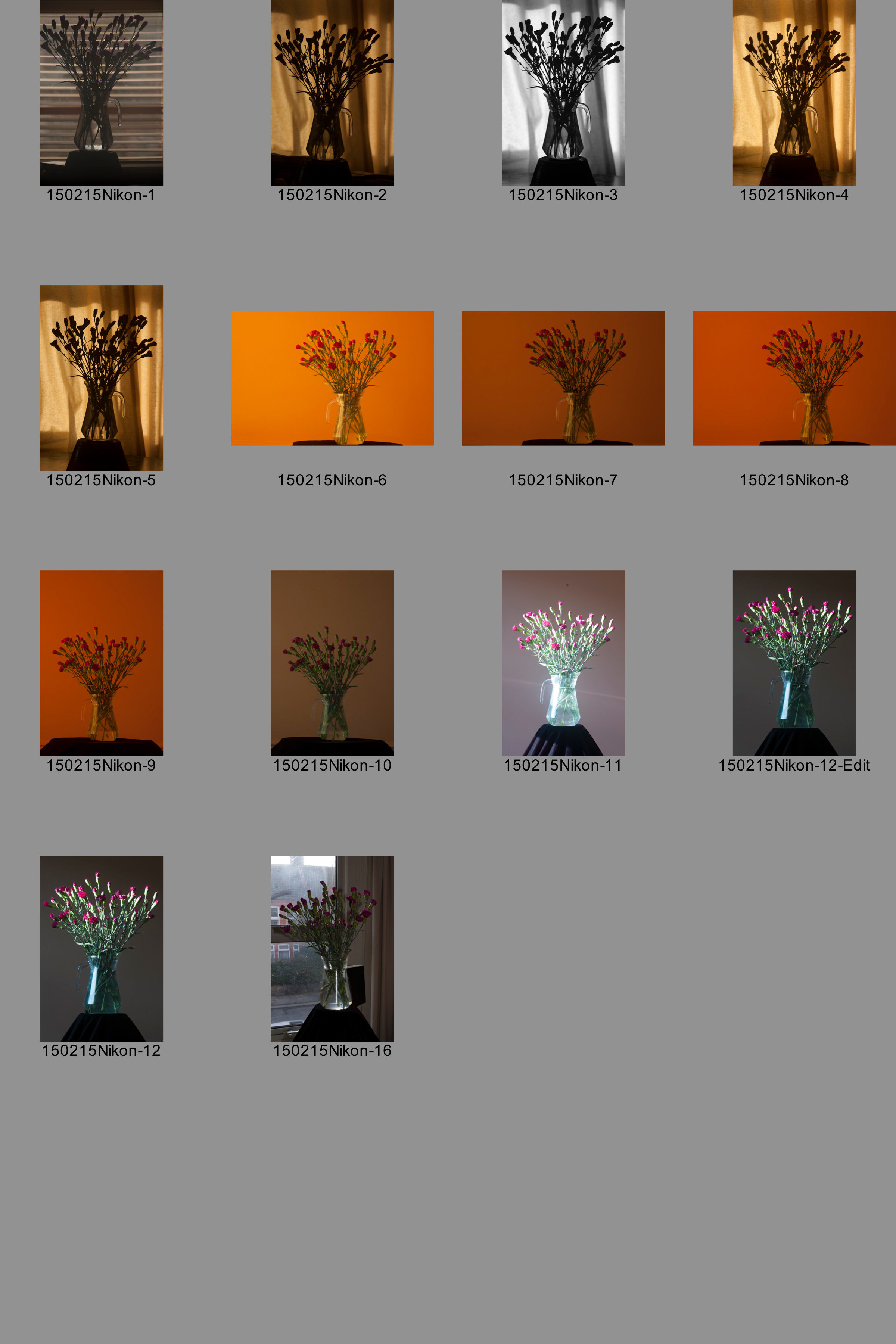 I then shifted the camera 90 degrees so the light was coming from the side of the frame rather than directly towards the lens. I experimented with trying a landscape formatted picture, but felt that – without something interesting on the background (shadows, perhaps) – the flowers suited a more vertical treatment. The low evening light was quite strongly warm, particularly when filtered by the oatmeal curtains. I tried different white balances, but overall did not like the resulting muted colour and lack of contrast (10 on the contact sheet). I drew the curtains to get more contrasty, undiffused light. I had draped a wider support (a cable drum) with black velvet to cut down on internal reflections but as the sun sank outside this did not raise the jug high enough for it to remain evenly lit, so I went back to using the upturned plant pot, but this time draped with the cloth. The effect was better, but the light hiting the water-filled jug reflected a sharp shaft of light on the wall behind the flowers (shot 11). To stop this, I taped my notebook to the back of the jug (shown in shot 16) and took the final shot. Annoyingly, you can just see the notebook to the left of the jug’s bottom (12) but – with the light vanishing for the afternoon and tea needing to be served on the table – was able to clone it out later (12-edit, the submitted image).