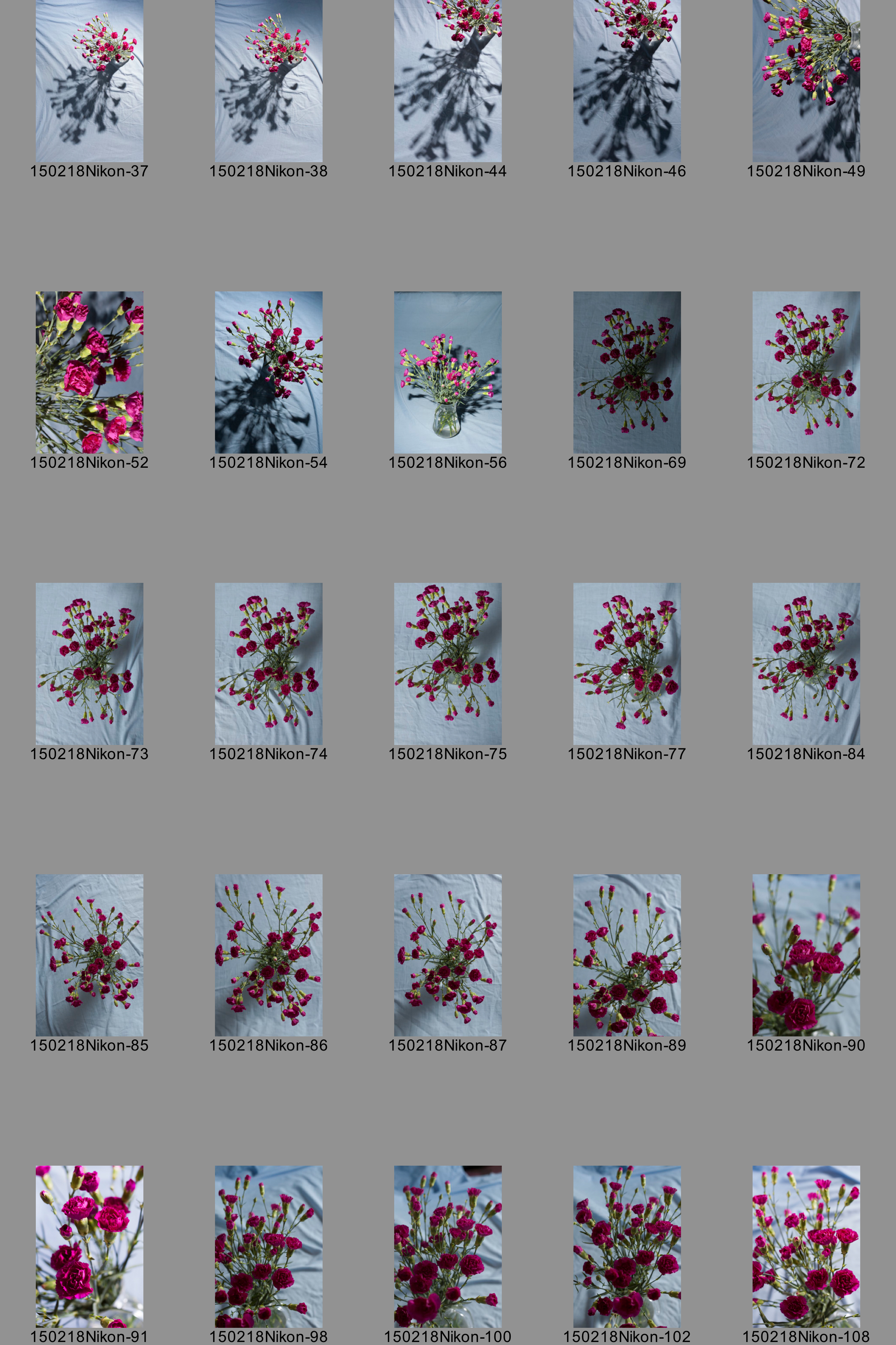 But instead, I gave up on the hard shadow 3D effect and instead added a shoot-through umbrella to the lighting setup, diffusing the light and losing a lot of the shadow; I also started working closer (69 onwards) losing the sense of 3 dimensions as I moved in but gradually becoming aware that the magenta of the flowers was nicely set off by the pale blue of the sheet, while the green of the stems stood out on the other side of the blue. Rather than a form picture, I was making a colour one. Picture 90 (the number of pictures shows the other downside to not using a tripod – rather than being able to sort the framing and then concentrate on the lighting effect, I was constantly reframing as well) is the one that I plumped for in the end; it also works at giving an idea of depth, thanks to the shallow focus and isn’t bad in terms of the texture of the flowers either, but the colour I think is closest to the effect of the carnations in reality…